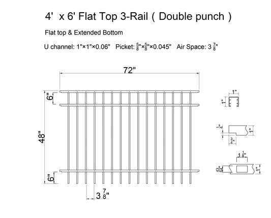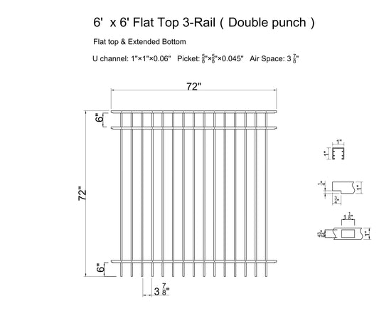 [PRICE PER FOOT] Ornamental Aluminum Flat Top 6' Tall 3-Rail Fence Panel with 3-7/8" Air Space